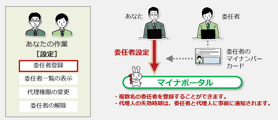 マイナポータル連携をするためには、事前にマイナポータルで代理人の登録を行う必要があります。