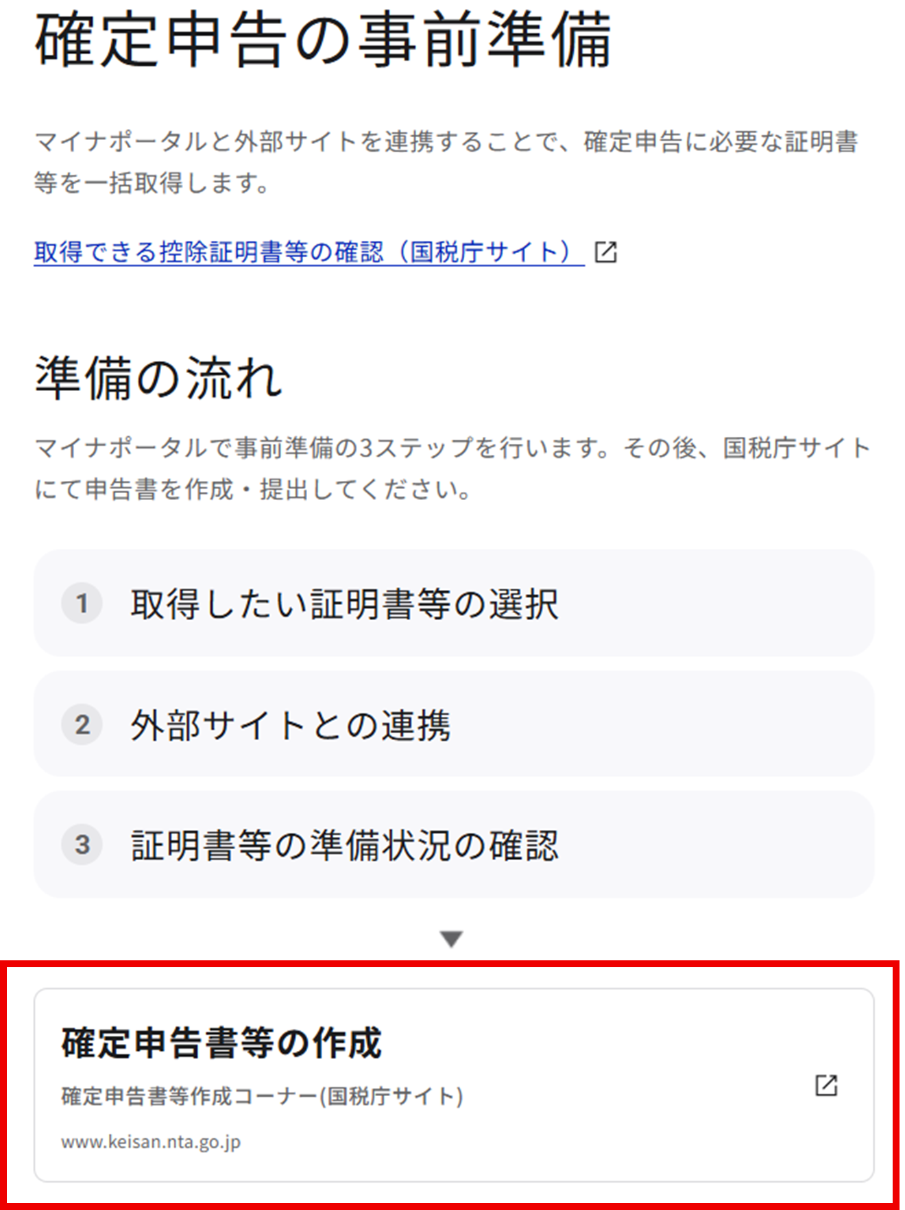 ご自身とご家族分のマイナポータル連携が完了したら、確定申告書等作成コーナーにアクセスして、確定申告を進めましょう。